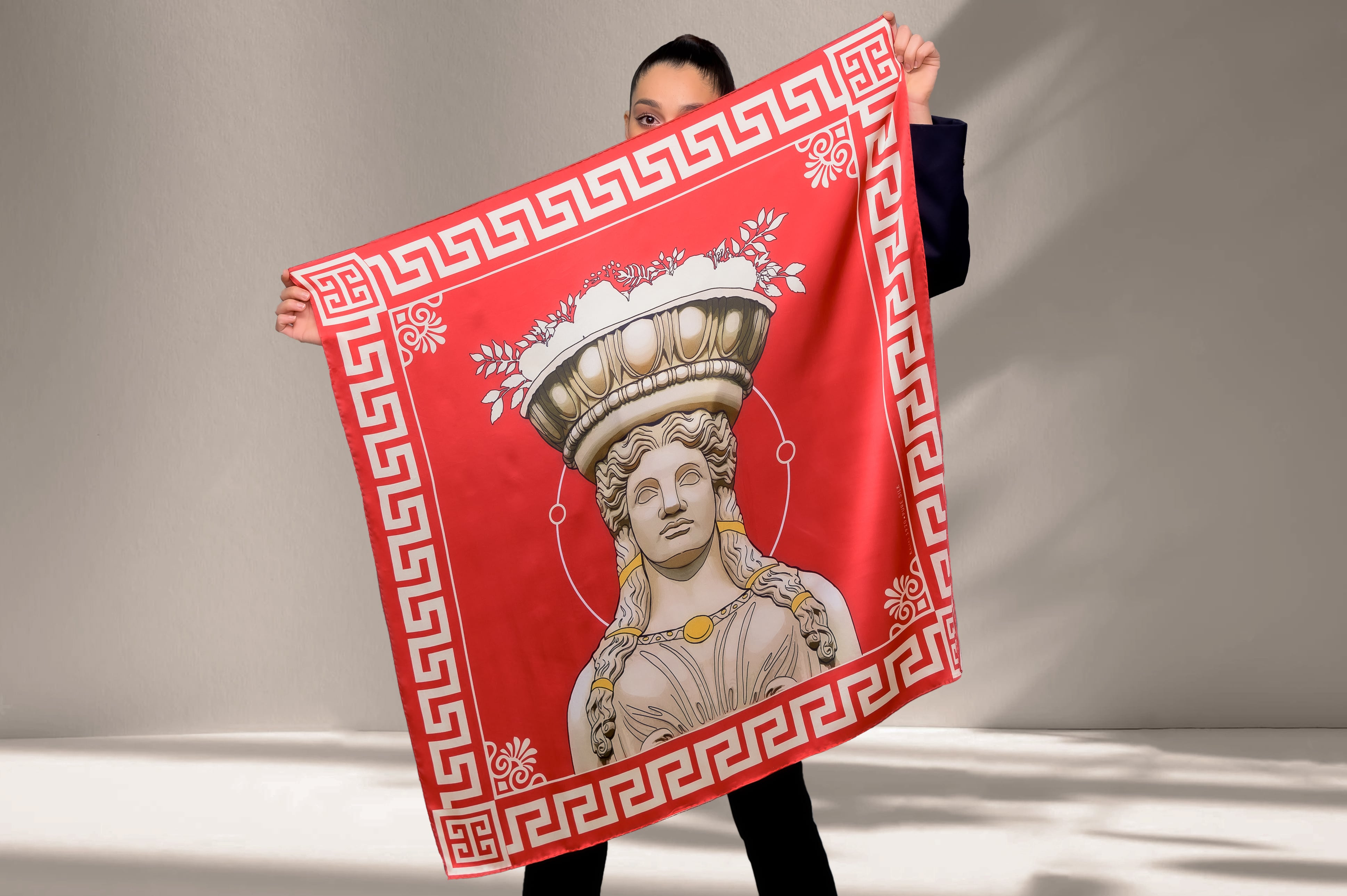 Red large square silk scarf with Caryatid