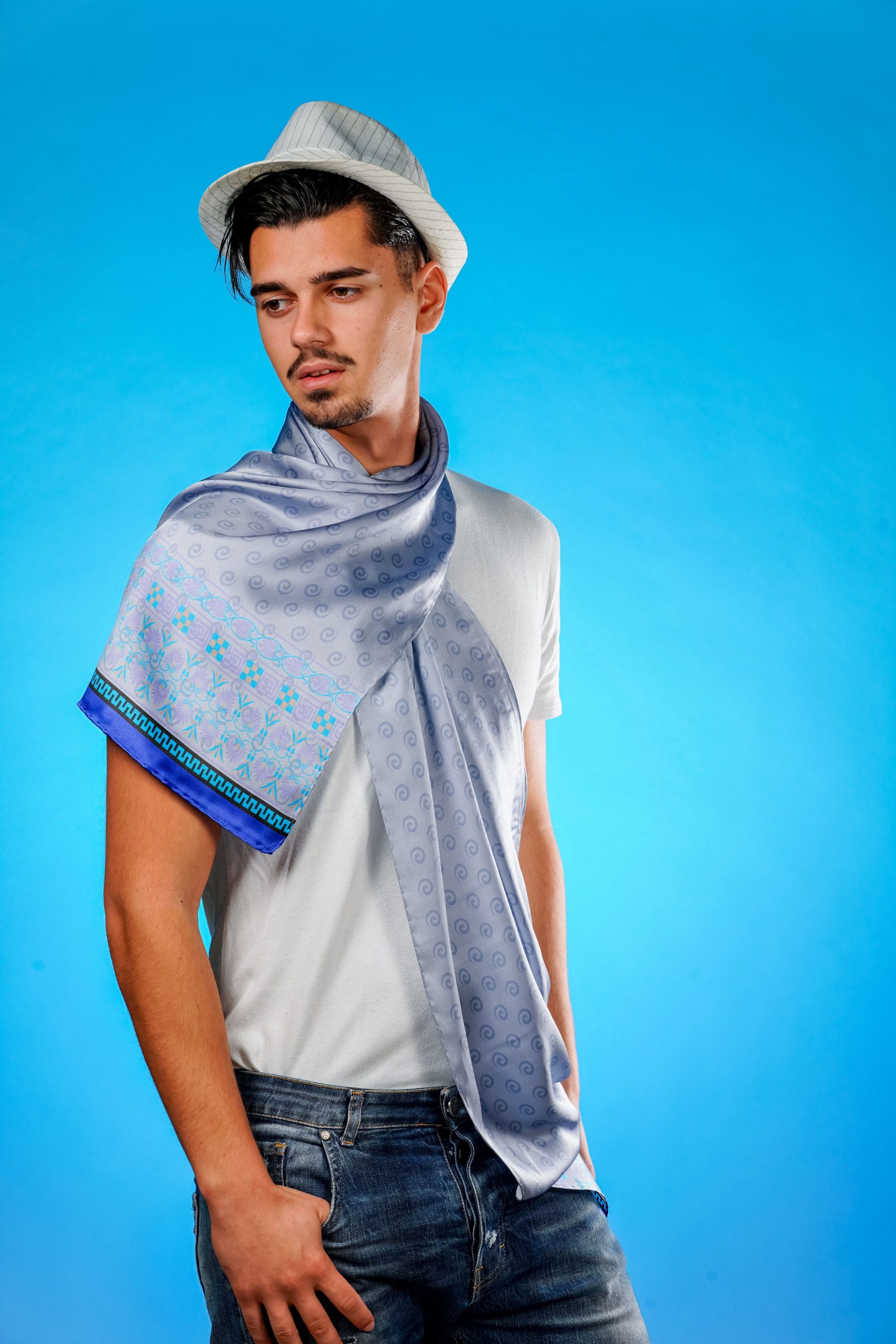 Cream-blue “HELLENIC ALPHABETA” silk scarf
