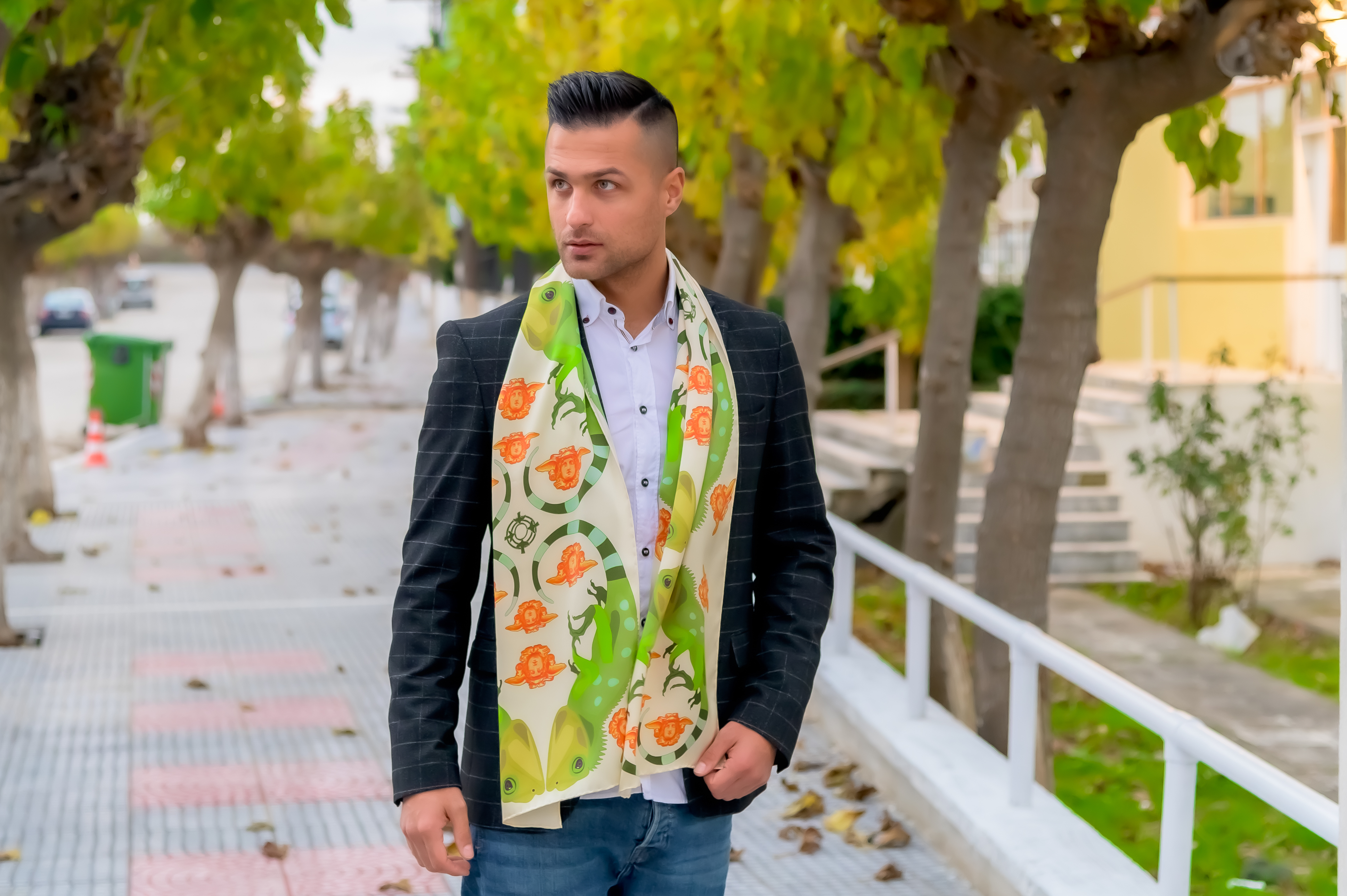 “The Iguana” sparkling green silk scarf
