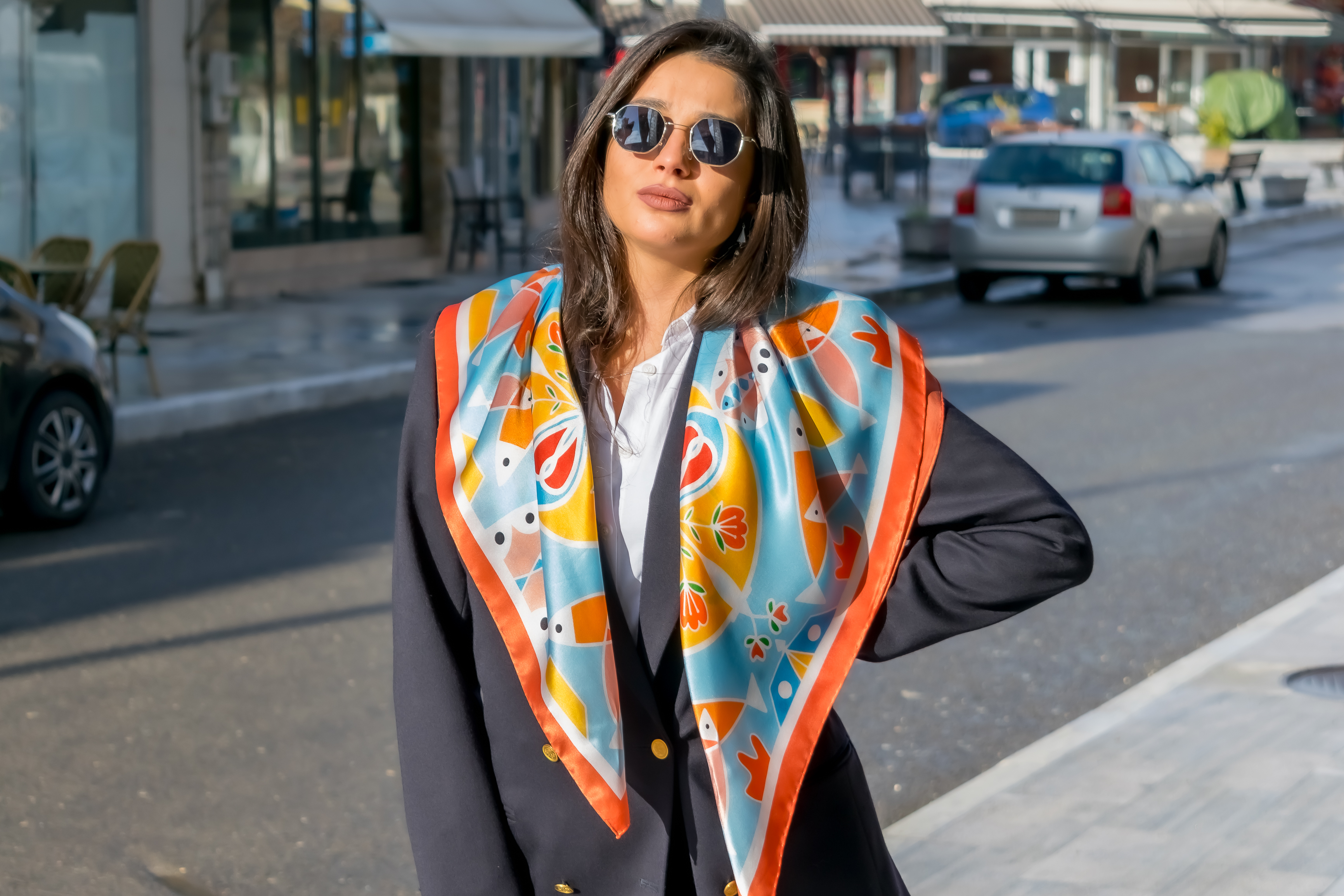 Blue and orange pure silk scarf